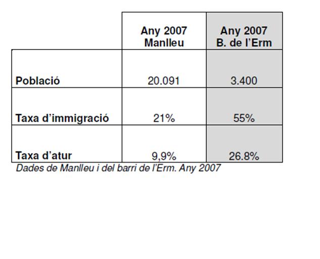 L'any 2009 la taxa d'immigració a Manlleu arriba a un màxim del 23,63%, un 78,55% de la qual és d'origen magrebí. Aquesta població es concentra majoritàriament al barri de l'Erm. En aquest sentit, s'han elaborat diversos estudis sobre la millora del barri, i s'ha evidenciat que l'Índex d'Atur és força més elevat al barri de l'Erm que a la resta de la ciutat i que la població del barri es caracteritza per ser poc qualificada i amb un nivell educatiu inferior a la resta de la població. Aquests estudis van confirmar que a més de treballar en habitatge, equipaments i espais públics, s'havia de donar resposta a les problemàtiques socials i econòmiques detectades al barri. | |||||
