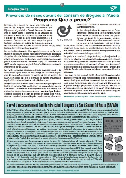 Degut a aquestes dificultats i a la manca d'un referent clar a la població en relació al consum de drogues, tan per adults com per a joves, s'acorda com a conclusió del Pla de Drogues local, aprovat l'any 2008, la creació d'un servei gratuït i confidencial, el SAFAD, amb el suport de la Diputació de Barcelona i el Centre d'Atenció i Seguiment de drogodependències (CAS) de la Mancomunitat Penedès – Garraf.