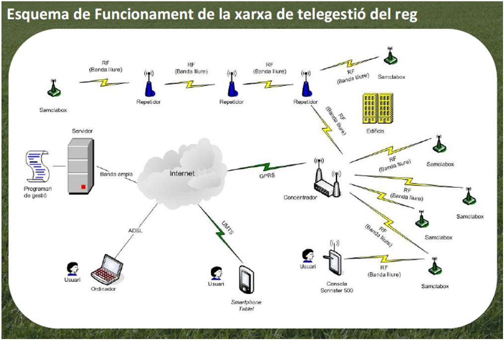 - L'equip concentrador. Aquest equip comunica mitjançant telefonia mòbil (GPRS, amb qualsevol operador del mercat) a un servidor on s'ubica el programari de gestió. D'altra banda, aquest equip es comunica per radiofreqüència amb la resta de dispositius que formen el sistema. L'Equip Concentrador incorpora també els diversos sensors de pluja, vent i temperatura.