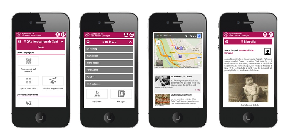 Per altra banda, s'ha creat un espai web per a cada un dels personatges cada un amb una URL particular, enllaçada amb el QR corresponent. Aquest mateix espai web, dóna accés a un mapa i un llistat dels carrers inclosos en el projecte. Igualment, hi ha disponible una app de realitat augmentada per a mòbils.