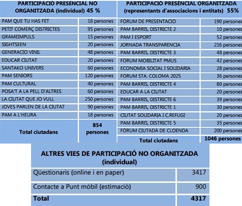 Han participat presencialment 1841 persones de les quals el 45% a títol individual i amb poc o cap hàbit de participació. En formats online o en activitats de carrer la participació va ser de 4.317 persones. Es van recollir 5.142 aportacions de les quals 3.417 amb qüestionaris de priorització d'objectius i 1725 propostes d'acció concretes.