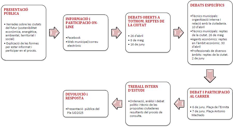 S'han realitzat diferents debats oberts a la ciutadania per parlar sobre els reptes de la ciutat, que van consistir en dos moments de participació presencial en els que els i les participants van pensar, formular i prioritzar propostes de futur al voltant dels tres eixos temàtics que engloben el procés de SJD2025: la ciutat equilibrada i sostenible; la ciutat emprenedora i innovadora; i la ciutat de les persones.