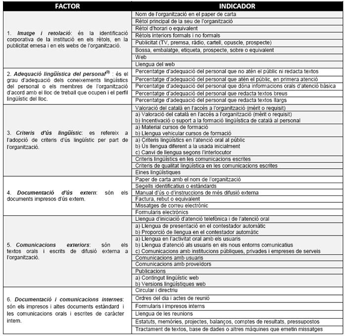 Cada factor o àmbit té un valor entre 0 i 100 i del càlcul de tots sis factors s'obté una mitjana ponderada que s'anomena índex de normalització lingüística (INL). Aquest valor, situat també entre 0 i 100, reflecteix el grau de normalització global de l'organització i permet establir diferents categories d'acord amb l'ús del català. El factor 2 és el que reflecteix les competències lingüístiques del personal. Aquestes categories es concreten segons els diferents intervals de l'INL obtinguts: