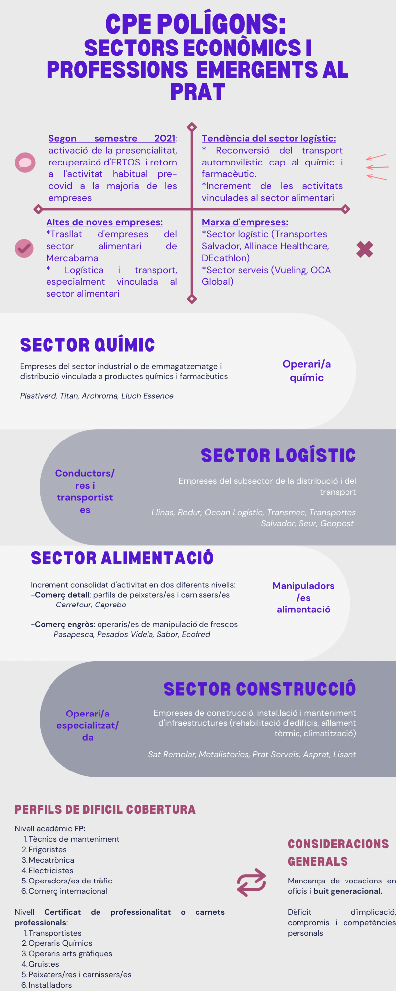 L’oficina de Polígons d’Activitat Econòmica es vertebra en 4 línies estratègiques. En termes generals s’ha desenvolupat un treball interdisciplinari constant d’ identificació, prospecció i seguiment d’empreses, i interlocutors en les àrees implicades, amb la finalitat de saber quines són les mancances, les oportunitats i les necessitats en relació a les quatre àrees estratègiques. Aquestes tasques s’han portat a terme mitjançant entrevistes, comissions de seguiment del projecte i difusió dels assoliments. Tot això s’ha traduït en plans formatius adaptats a les noves necessitats entorn el mercat laboral i els objectius marcats en l’agenda 2030.