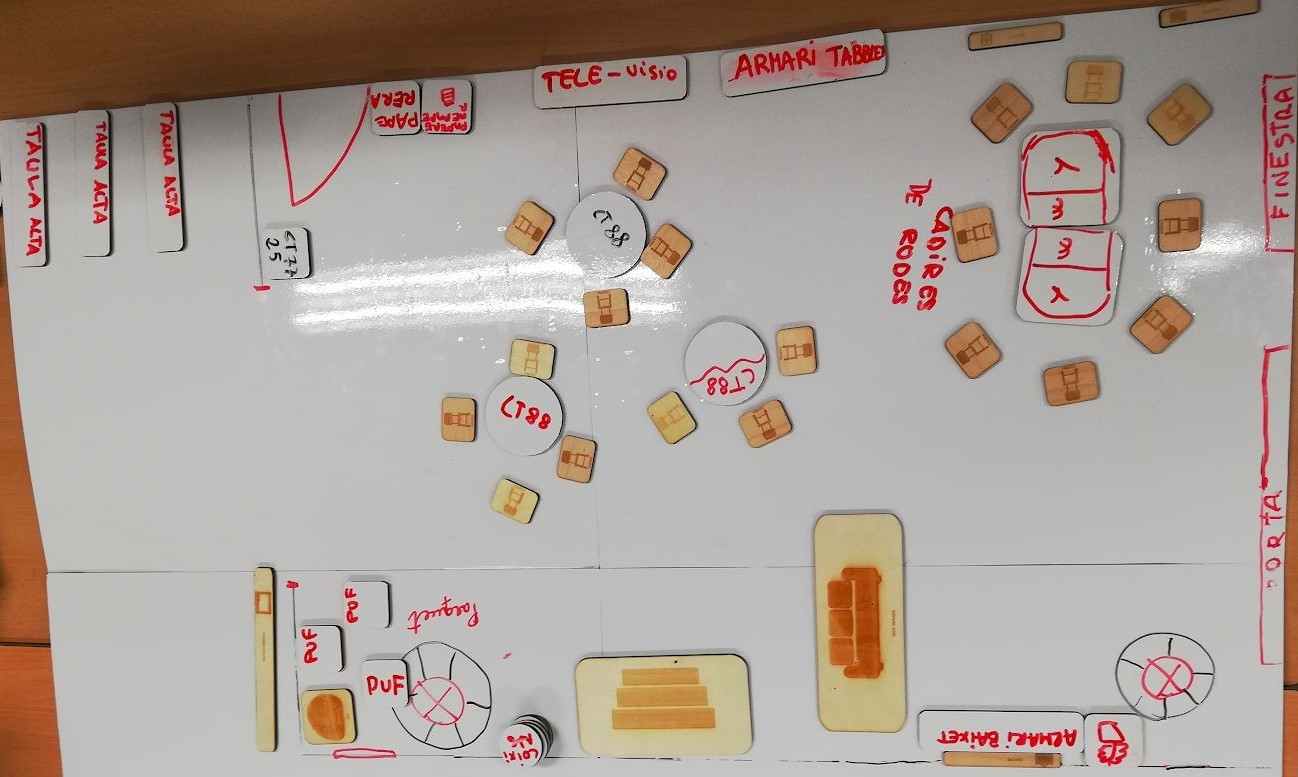 - Sessió 3: A l’última sessió del codisseny s’hi afegeixen les famílies. En aquesta sessió es fa el disseny final de l’espai a transformar. Els participants compten amb un plànol a escala de l’aula real que desitgen canviar i amb les peces que representen els diferents objectes van dissenyant com serà la seva aula definitiva. Aquest disseny final incorpora les reflexions fetes a totes les sessions anteriors i les opinions de docents, famílies i estudiants que han participat en el procés.