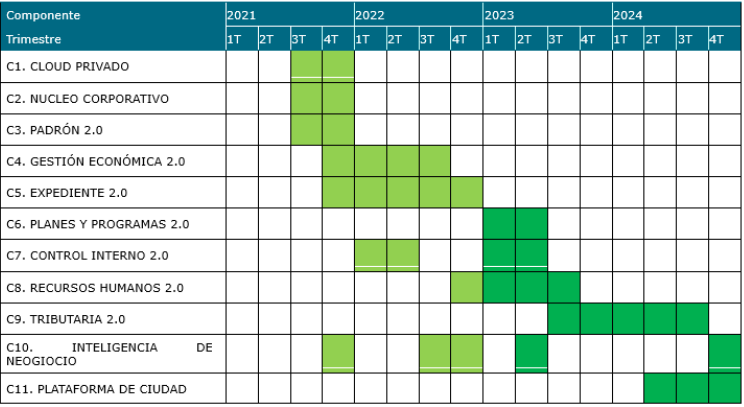 El projecte ha estat dissenyat i concebut per a la seva implementació en quatre anualitats, seguit d'una fase de suport i manteniment durant vuit anys més, tenint en compte l'abast i impacte de la implantació, així com la seva vida útil.