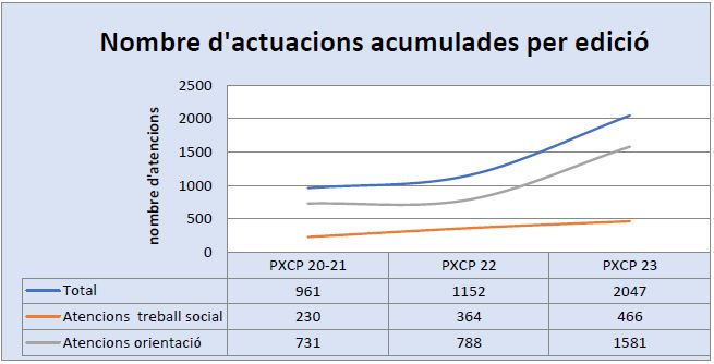 En total reporten haver derivat des de Benestar Social i altres serveis com el Departament de Treball, SIAD, Serveis Base, etc., un total de 126 persones noves al Pla de Xoc des de gener fins a desembre de 2023. D'altra banda, en l'àrea de Treball Social s'han realitzat 240 altes i 466 atencions durant l'any. En l'àrea d'Orientació Laboral, s'han atès 170 persones que estaven d'alta derivades de l'àrea de Treball Social, sumant 1581 atencions totals d'orientació.