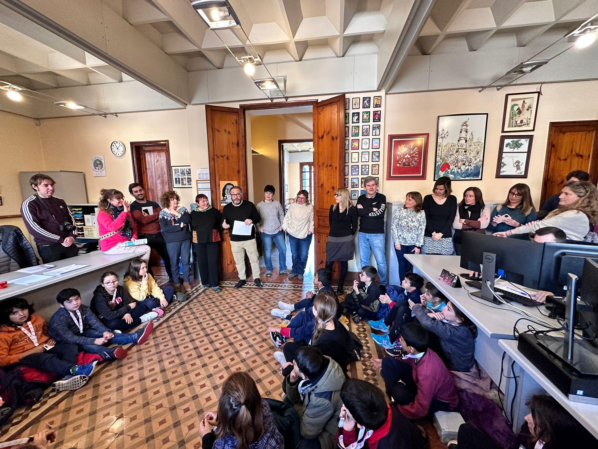 Roda de premsa després dels tres primers mesos de prova pilot; els infants de l'Escola Prat de la Riba van ser qui va donar resposta a les preguntes sobre el seu vincle (seu IMCR)