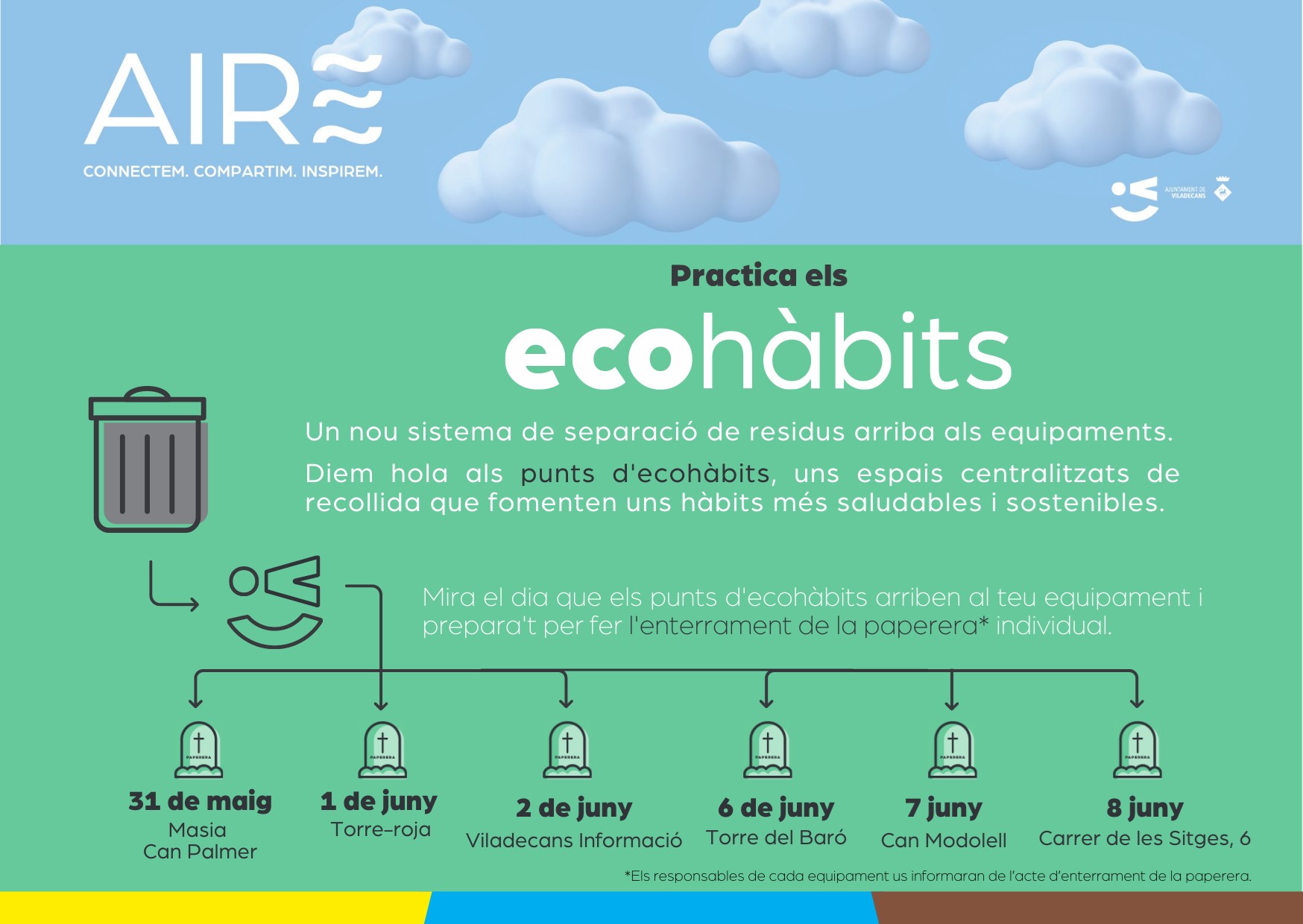 Gràcies a l'esdeveniment simbòlic de "L'enterrament de les papereres" s'ha explicat al personal municipal les motivacions del canvi, els objectius del projecte i la correcta segregació de residus, al mateix temps que cada empleat porta la seva paperera d'escriptori per què el servei de recollida se l'emporti de manera definitiva.22 edificis d'oficines i serveis municipals funcionen amb els ecohàbits.